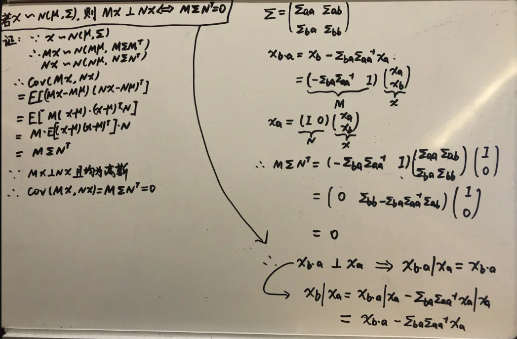 令\begin{cases} x_{b \cdot a}=x_{b}-\Sigma_{b a} \Sigma_{a a}^{-1} x_{a} \\ \mu_{b \cdot a}=\mu_{b}-\Sigma_{b a} \Sigma_{a a}^{-1} \mu_{a}\\ \Sigma_{b b \cdot a}=\Sigma_{b b}-\Sigma_{b a} \Sigma_{a a}^{-1} \Sigma_{a b} \end{cases}